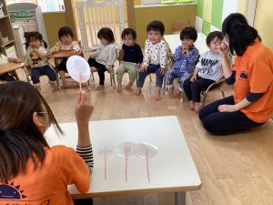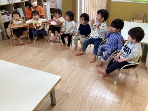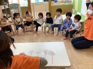 プレゼントを渡した後は、みんなでペープサートを作ったリズム遊びを楽し見ました♬