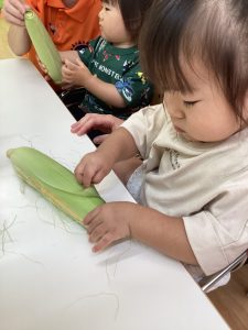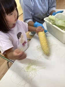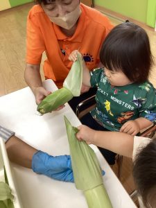 今週は、食育活動で、夏の季節には欠かせないトウモロコシの皮むきの体験を行いました🌽