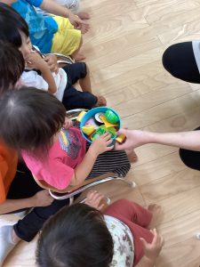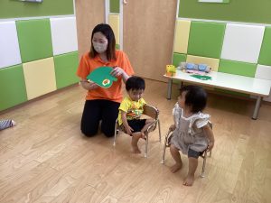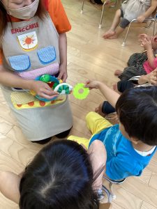 みんなが大好きなはらぺこあおむしのエプロンシアターに興味津々の子ども達☺️