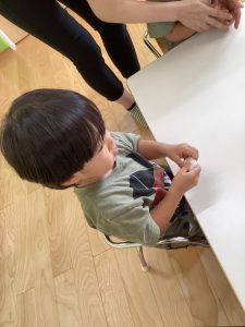 自分で貼れたお団子を見て満足気ですね😉