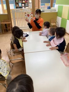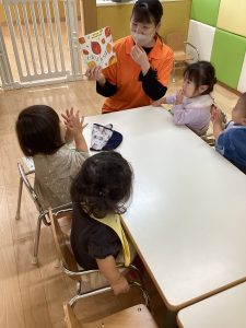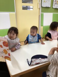 11月の2歳児さんの月間絵本となっていますが、2歳児クラスのお友達に限らず、0歳児・1歳児クラスのお友達も楽しみながら見てくれています😌✨
