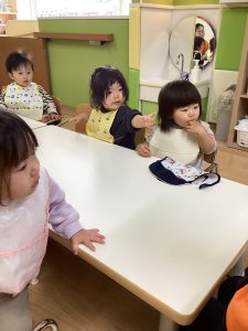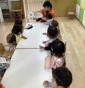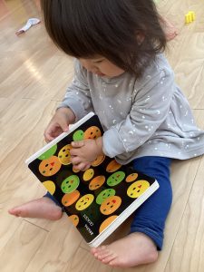 11月の2歳児さんの月間絵本となっていますが、2歳児クラスのお友達に限らず、0歳児・1歳児クラスのお友達も楽しみながら見てくれています😌✨