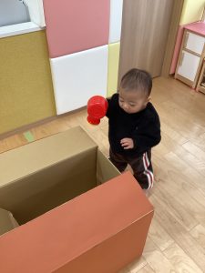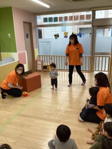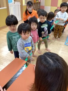 読み聞かせのあと、何やら茶色の箱が出てくると…なんだろう??と不思議そうに見つめていました。