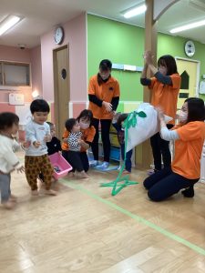 「誰か手伝ってくれないかな??…」と犬役の先生が子供たちに向けて声をかけると…たーくさん応援してくれるお友だちが出てきてくれました😃