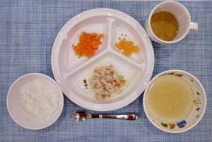(写真は離乳食後期です。年齢によって盛り付け量を変えて提供しています。)