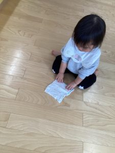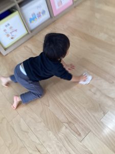 小さなおててでしっかりと布巾を握ってお掃除です👍