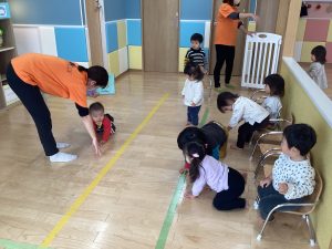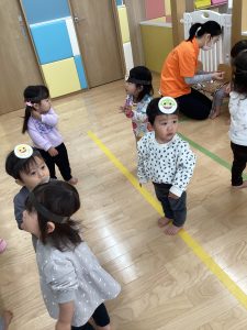 まず始めは、「Hello song」の曲に合わせて身振り手振りをします♪