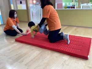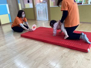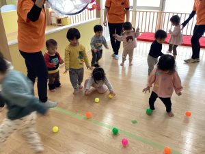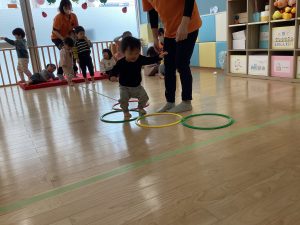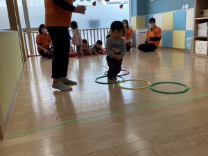 カリキュラムの体操では、ボール入れやジャンプや手押し車にも挑戦!