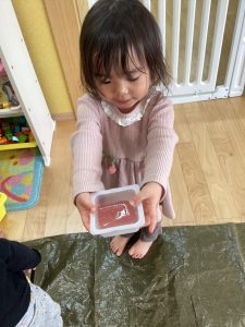 道具を使ったり見立て遊びをしながら感触を楽しむ姿が見られました。