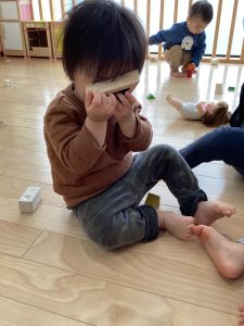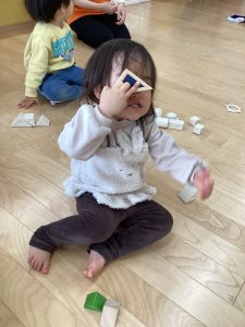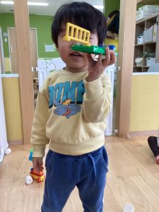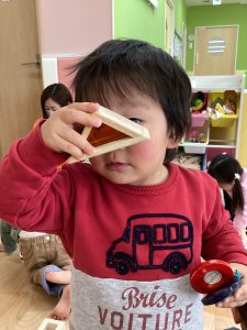 積み木を目に当てて先生や室内の景色の色が変わるのを楽しんでいました✨