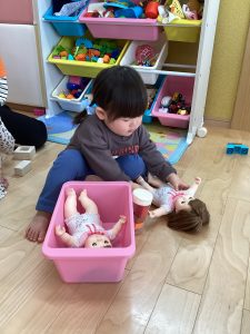 2人のぽぽちゃんのお世話をしているお友だちの姿も。手際がいいですね!