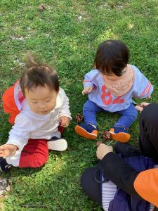 公園には春の花・タンポポの綿毛をたくさん見ることができ、どうぞ!と松ぼっくりや綿毛を新しいお友だちに見せてくれました