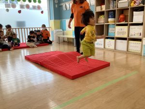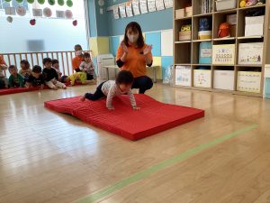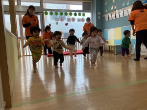 カリキュラムの体操では、よーいどん!のかけ声に合わせて思いっきり走る子どもたち