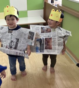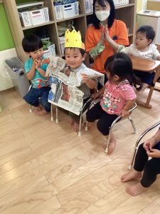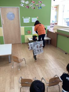 どんどん形が変わっていく新聞紙に興味津々の子どもたちでした!