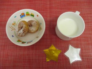 今日のおやつは、セサミドーナツでした。甘くて外はサクッ、中はフワッとしたドーナツを手に持ってニコニコと嬉しそうに食べてくれました!!