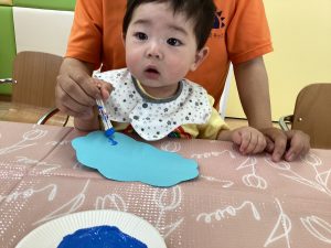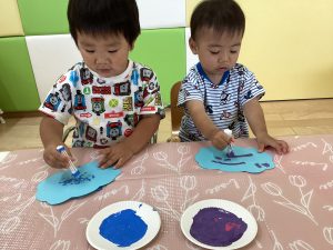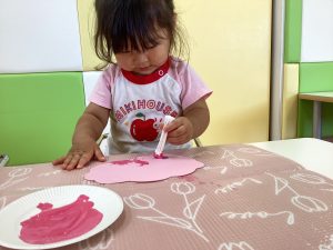 綿棒にたっぷり絵の具をつけると思い思いにスタンプして色をつけてくれましたよ🩷