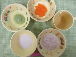 (写真は後期食です。月齢によって形、固さ、盛り付け量を変えて提供しています。)