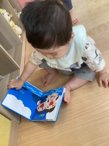 0歳児のもも組さんのお友だちも絵本に興味津々!