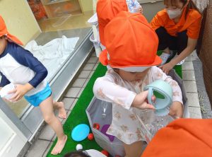 7月には初めてのプールにドキドキしていたお友だちも今ではすっかり慣れてお水遊びを満喫しています![]()