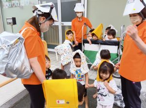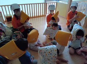 避難後、自分からしっかりお友だちの手を繋ぐ姿が見られたり、いつもと違う雰囲気の中でも落ち着いて避難する姿が見られたりと、訓練を重ねる中で、子どもたちなりに訓練の流れや訓練の大切さを理解してくれているのだなぁととても感心させられました!