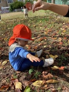 絵本に出てきた落ち葉の場面を思い出しながら公園で本物の落ち葉に触れ、“ザクザク” “カサカサ”などの音を楽しみました☺️
