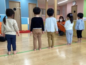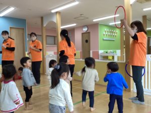 青いフラフープの時は進む、赤のフラフープの時は止まるという「信号ゲーム」のスタートです🚥