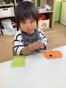もも組さんはシールをペタペタと貼ってお顔作りに挑戦!