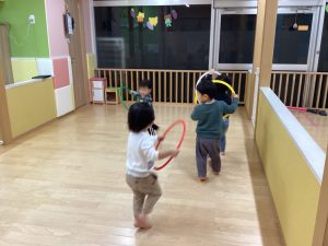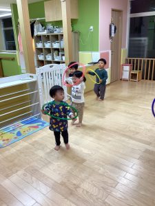夕方、フラフープで電車ごっこをしていると「電車の歌流して!」とリクエストが…💭