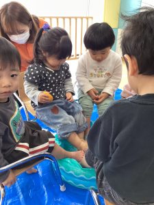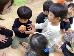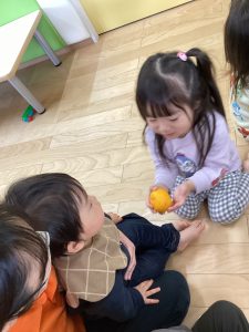 初めて体験するももぐみさんもゆずに触れ、お友だちと一緒に楽しむことができました💕