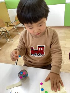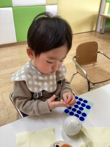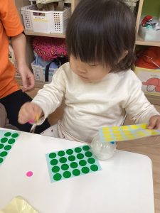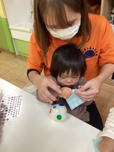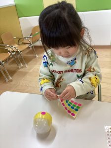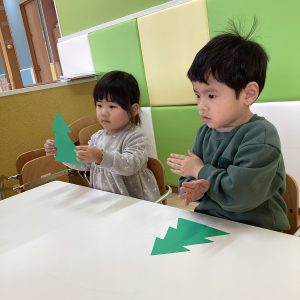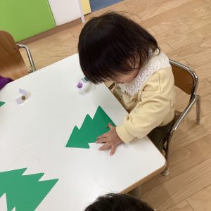 こちらでは、いちごぐみさんとももぐみさんがシールでツリー作り🍓🍑