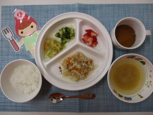(写真は離乳食後期です。年齢によって形、固さ、盛り付け量を変えて、提供しています。)
