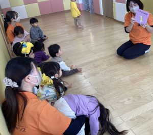 逃げる姿やまいている姿に興味津々で子どもたちも絵本の世界に入り込んでいるようでした🧡👦🏻👧🏻🧡