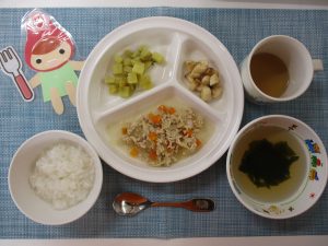 (写真は離乳食後期です。年齢によって形、固さ、盛り付け量を変えて、提供しています。)