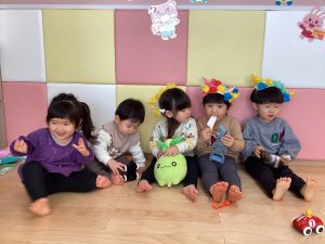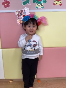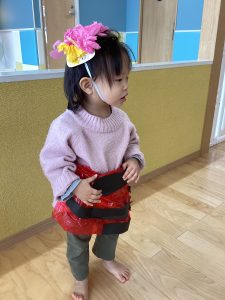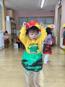 自分たちで作った鬼のヘアバンドとスカートを着ました👕
