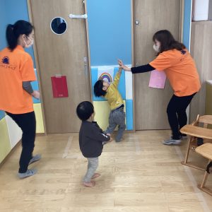 お名前呼びでは、りんごぐみさんやいちごぐみさんがHere !でお返事していく姿を真似て、ももぐみさんも手を挙げて応えてくれましたよ!!Good job 👍🏻