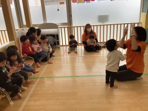 手遊びのコーナーでは、先生の手袋シアターに興味津々👀