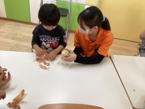 皮むきでは、初めの部分だけ先生たちが手伝うとあとはお手のもの!