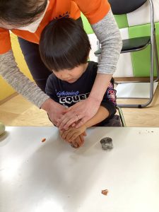 先生の手の上に子どもたちの手を重ねて一緒に行いました!