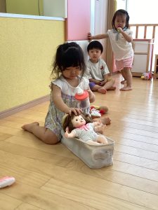 ポポちゃんを2、3体抱えて赤ちゃんのお世話をしている子も👶