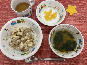 今日は、マーボー丼で食べやすかったので、みんなパクパクと自ら進んで食べていてあっという間に完食!お野菜がたくさん入ったスープも残さずにたべました♪サンライズキッズ保育園のみんなは、本当によく食べてくれますよ♪