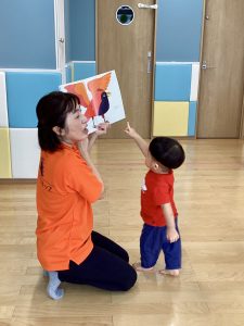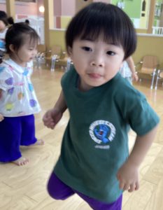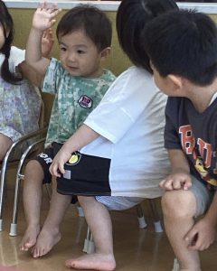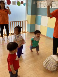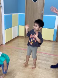 お馴染みのお名前呼びでは、Here!やGood!のジェスチャーや手を挙げて応えてくれたり、小さいお友だちは先生と一緒に手を挙げてと自分のできる仕草で挨拶を行ってくれました👍🏻🤚🏻