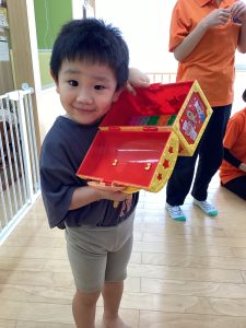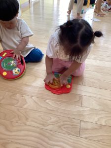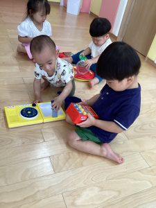 みんな大好きアンパンマンの宝箱やひらがなの載っている音の出るおもちゃなどそれぞれに興味のあるものを手に取り夢中になって遊んでいますね!