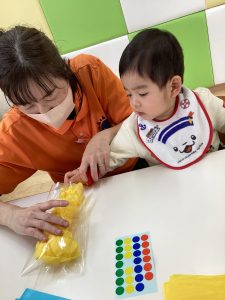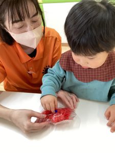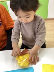 赤、黄色、水色の中から好きな色の紙を選んで袋に詰めていきます💛