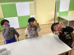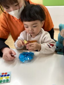 私はこれ!と僕は水色!とそれぞれに好きな色を選んで見事に鬼の顔に色がつきました⭐️