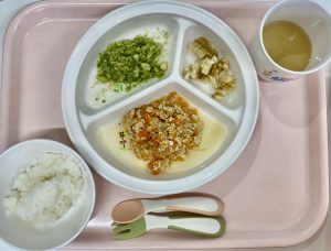 (写真は離乳食後期です。年齢によって形、固さ、盛り付け量を変えて、提供しています。)