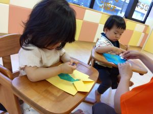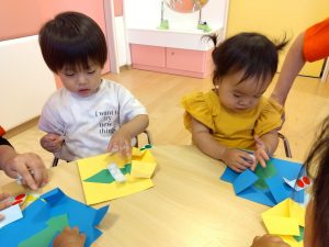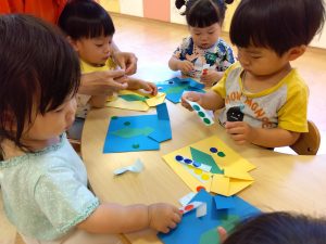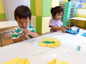 いちごぐみさんは、一度貼り方を伝えると自分でどんどん貼っていくお友だちがいたり、手についたシールが気になってシールをジーッと見つめたりするお友だちがいました!保育士が少し手助けをしてシールを貼ることが出来ると、とっても嬉しそうにしていましたよ![]()