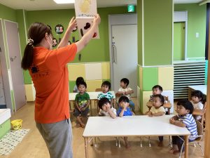 「ぽ–ん」と飛ぶ音に合わせて、子どもたちも一緒になって「ぽ–ん」と言って楽しみながら絵本を見る姿が見られました🎶