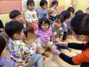 実際に桃の花の蕾を見たり、触って、「これが綺麗なお花になるんだよ」とお話があると、「かわいいね〜」とうっとりしているお友だちもいました🌸