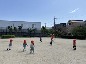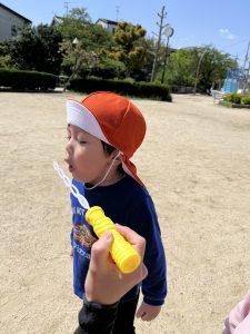 グラウンドの方ではシャボン玉を追いかけて思いきり身体を動かしてのびのびと遊んでいます♪