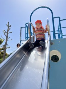 玉串川沿いを歩いたところにある『おふね公園』では、砂場遊びをしたり、おふねの遊具でハンドルを握って操縦して遊んでいます🚢